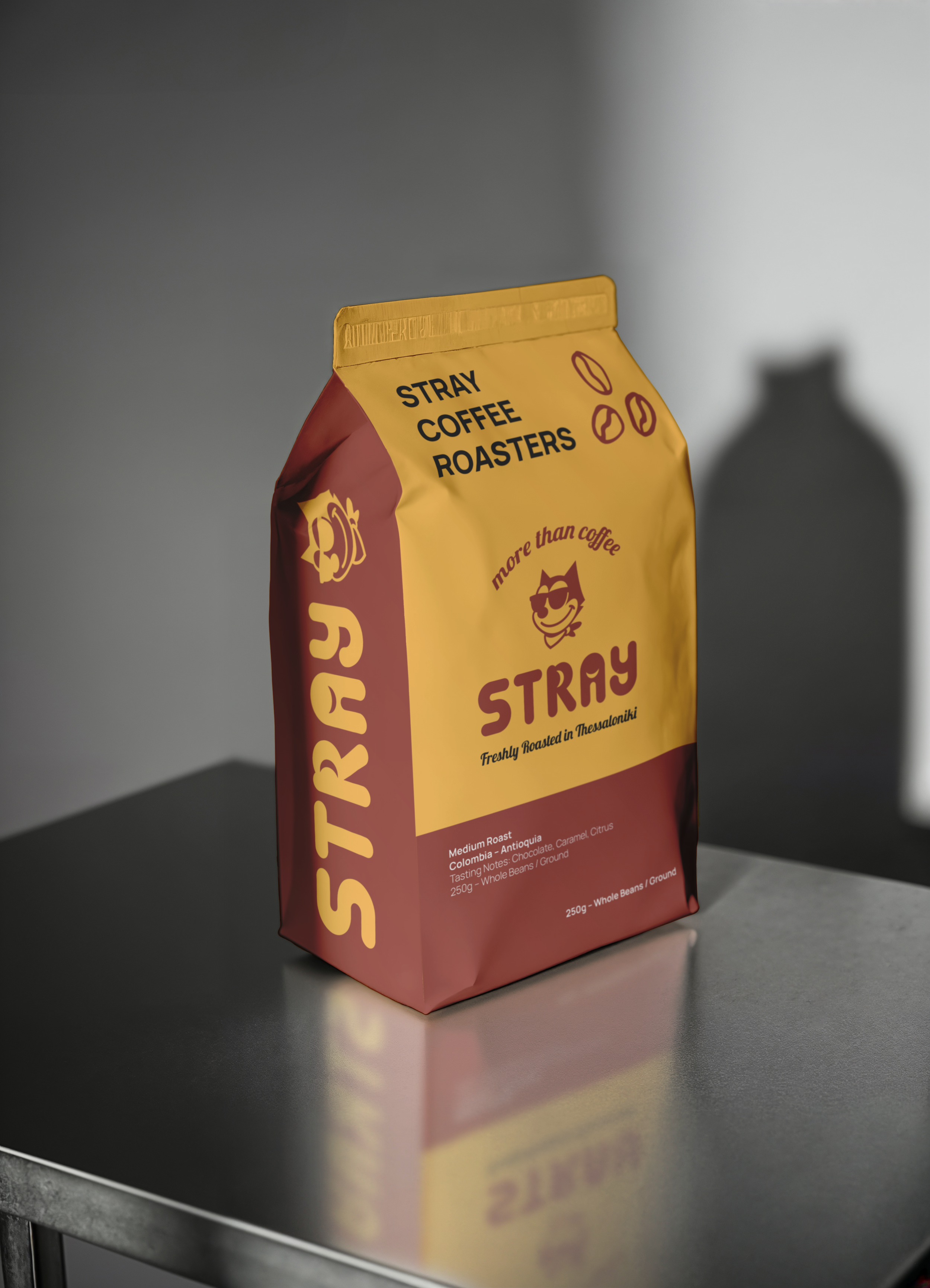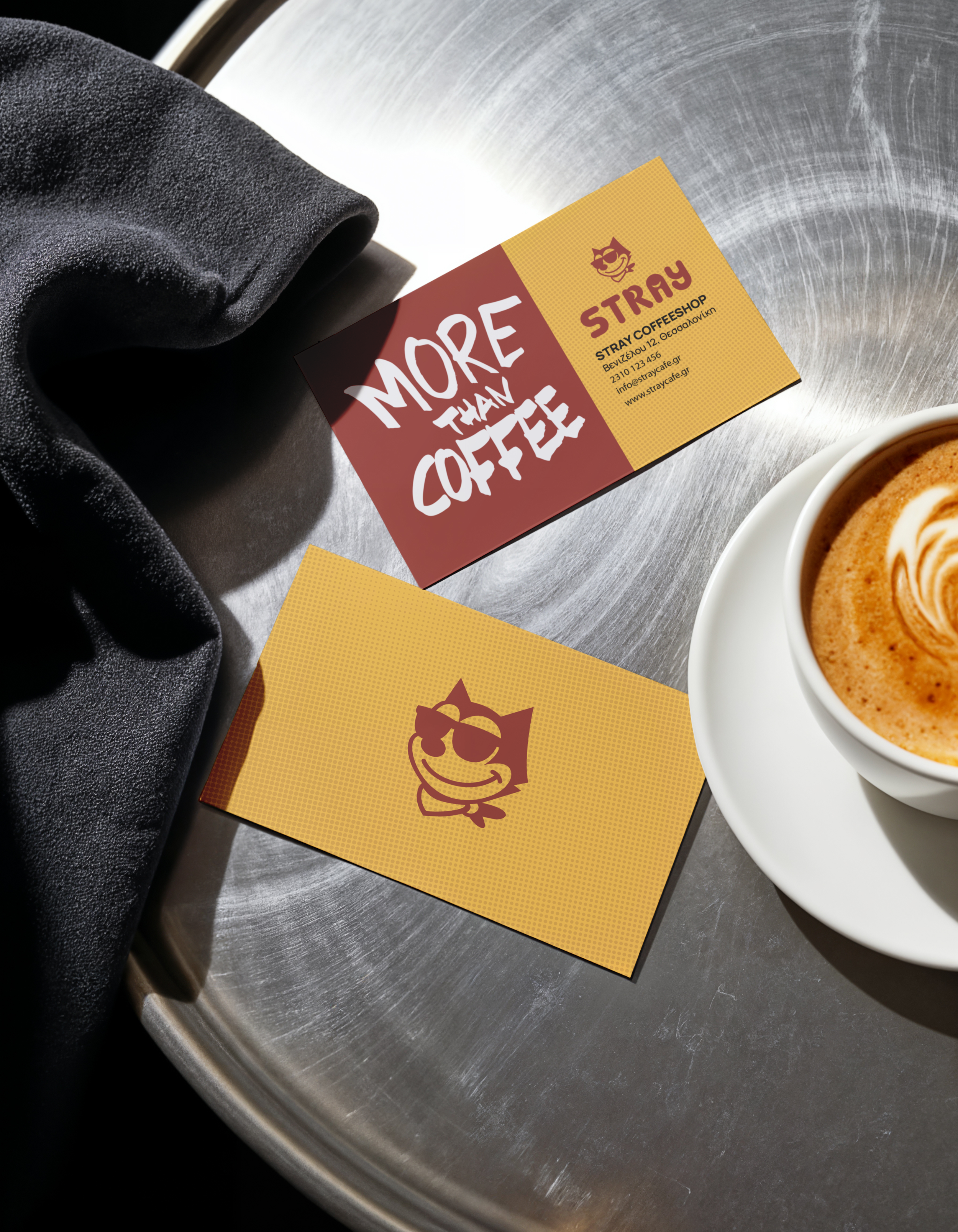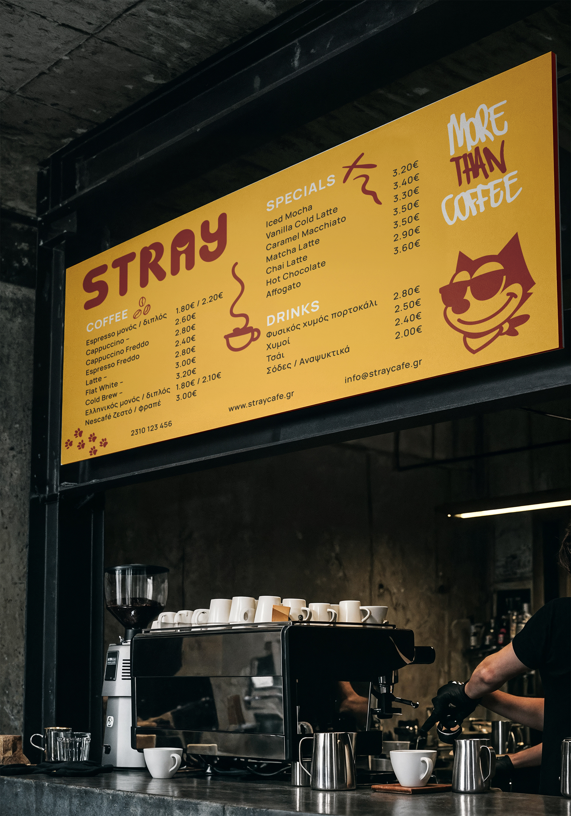 Stray is a branding project for an urban-style café inspired by street culture and bold, expressive character. The visual identity blends vintage charm with a contemporary, casual attitude, featuring custom typography, mascot illustration, packaging applications, signage, and social media assets. The goal was to create a brand that feels warm, playful, and unmistakably memorable.